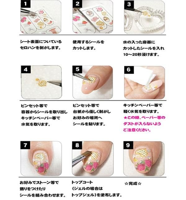 自爪、つけ爪、ケータイ、またジェルやスカルプに埋め込むことも可能です。シールには爪に優しい粘着剤を使用しており、曲面にもピッタリフィットします。
