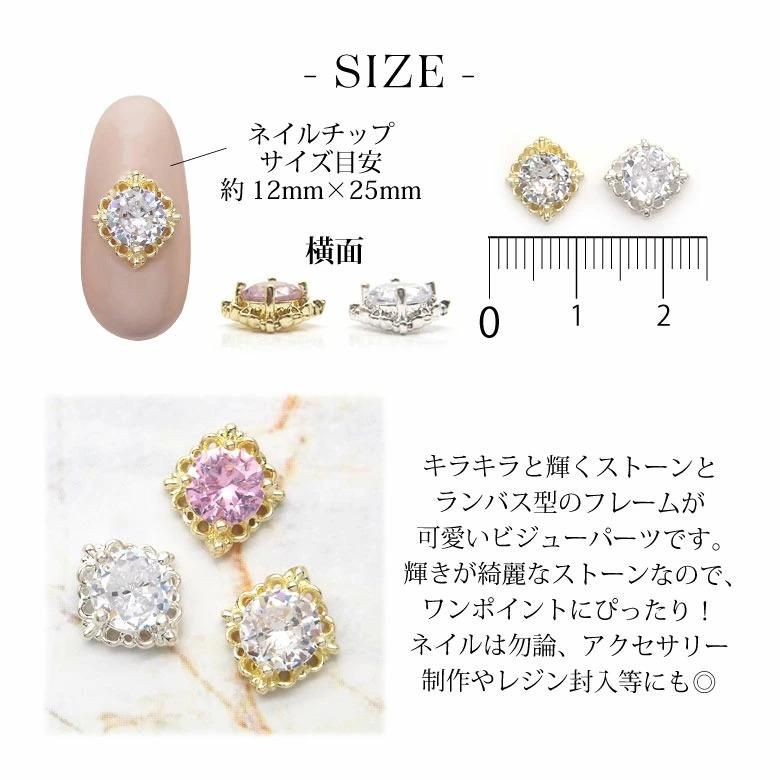 キラキラと輝くストーンとランバス型のフレームが可愛いビジューパーツです。