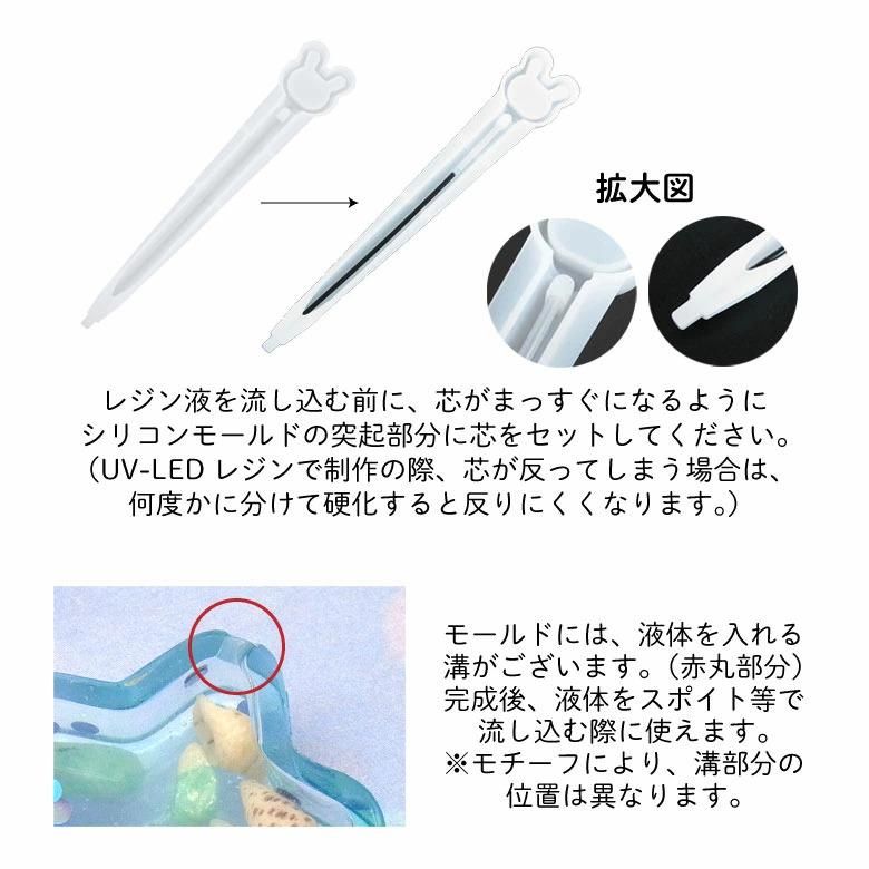 レジン液を流し込む前に、芯がまっすぐになるようにシリコンモールドの突起部分に芯をセットしてください。